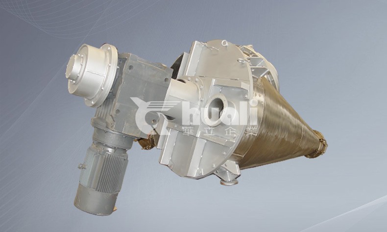 本機主要由錐形筒體、螺旋軸、傳動機構及出料部件等組成。物料由上部加入,電機帶動特制擺線針輪減速機,使螺旋軸系統(tǒng)作公轉(zhuǎn)和自轉(zhuǎn),大螺旋軸緊靠筒壁小螺旋軸靠近中心,兩螺旋軸同時作行星運動。將物料自下而上提升,形成沿錐形筒壁上升的物料流。同時轉(zhuǎn)臂帶動螺旋軸公轉(zhuǎn),使螺旋體外的物料混入螺旋體內(nèi),整個錐形筒體內(nèi)物料不斷錯位提升、相互摻混。由錐形筒體中心匯合向下流動。由于該機的三重混合作用,使物料能在較短時間內(nèi)達到混合均勻。