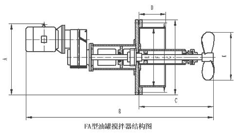 側向伸入式攪拌機是由儲罐的側壁伸入罐內,它通過法蘭蓋與罐體的開口法蘭相聯結。攪拌機的槳葉為船用螺旋槳型。由于螺旋槳的轉動,使罐內液體產生兩個方向的運動,一個沿著螺旋槳軸線方向向前運動,另一個沿螺旋槳圓周方向的運動。軸線方向的運動,由于受到罐壁的阻礙而使罐內液體沿著罐壁作圓周方向的運動,而液體沿螺旋槳圓周方向的運動,就使罐內液體上下翻動,這樣就使罐內液體得到攪拌,并可防止罐內沉積物的堆積。